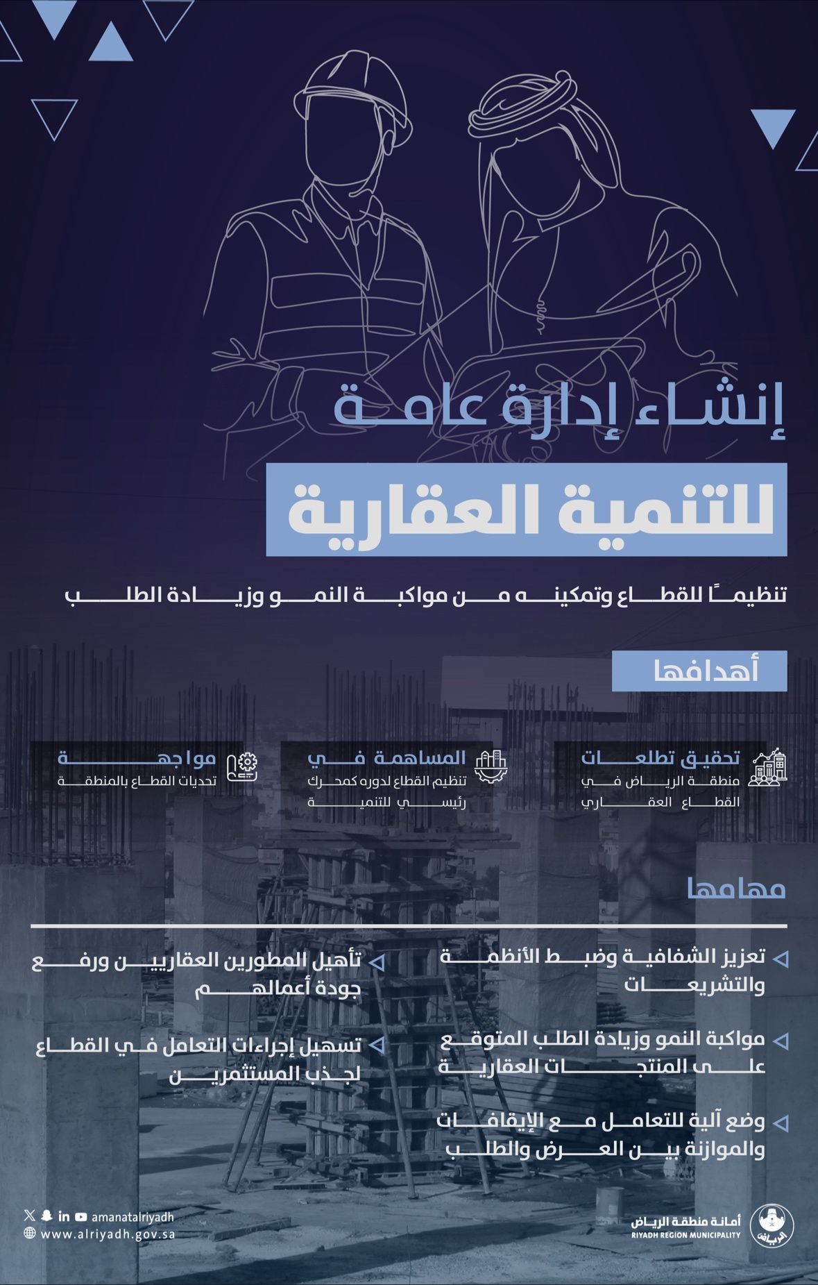 وجه صاحب السمو الأمير الدكتور فيصل بن عياف أمين منطقة الرياض، بإنشاء إدارة متخصصة في التنمية العقارية بمسمى (الإدارة العامة للتنمية العقارية)، وذلك لتحقيق تطلعات الرياض في القطاع العقاري الذي يعد من القطاعات الأساسية في المملكة، ويعتبر محورًا هامًا ومحركًا رئيسيًا للتنمية في المدينة، وهو المحتضن الأساسي للزيادة السكانية والعمرانية المتوقعة، والتي تعتمد بشكل رئيسي على مدى توفر الأراضي والعقارات المتاحة والمعلومات المتعلقة بها.
