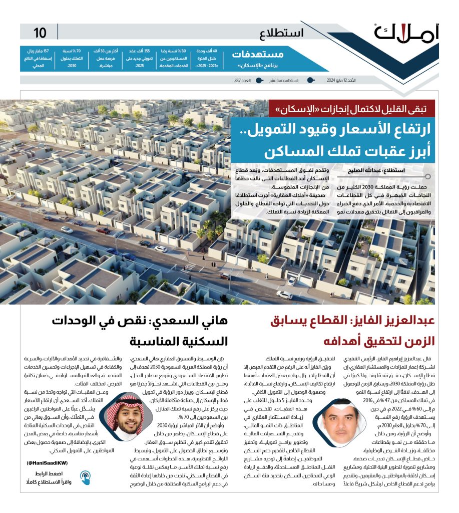 استطلاع: عبدالله الصليح: حملت رؤية المملكة الكثير من النجاحات المُبهرة في كل القطاعات الاقتصادية والخدمية، مما جعل الخبراء والمراقبون يتفاءلون بتحقيق معدلات نمو وتقدم تفوق المستهدفات، قطاع الإسكان إحدى القطاعات التي نالت حظها من الإنجازات الملموسة. صحيفة “أملاك العقارية“ أجرت استطلاعاً حول التحديات التي تواجه القطاع، والحلول الممكنة لزيادة نسبة التملك ومعقولية أسعار العقارات السكنية..