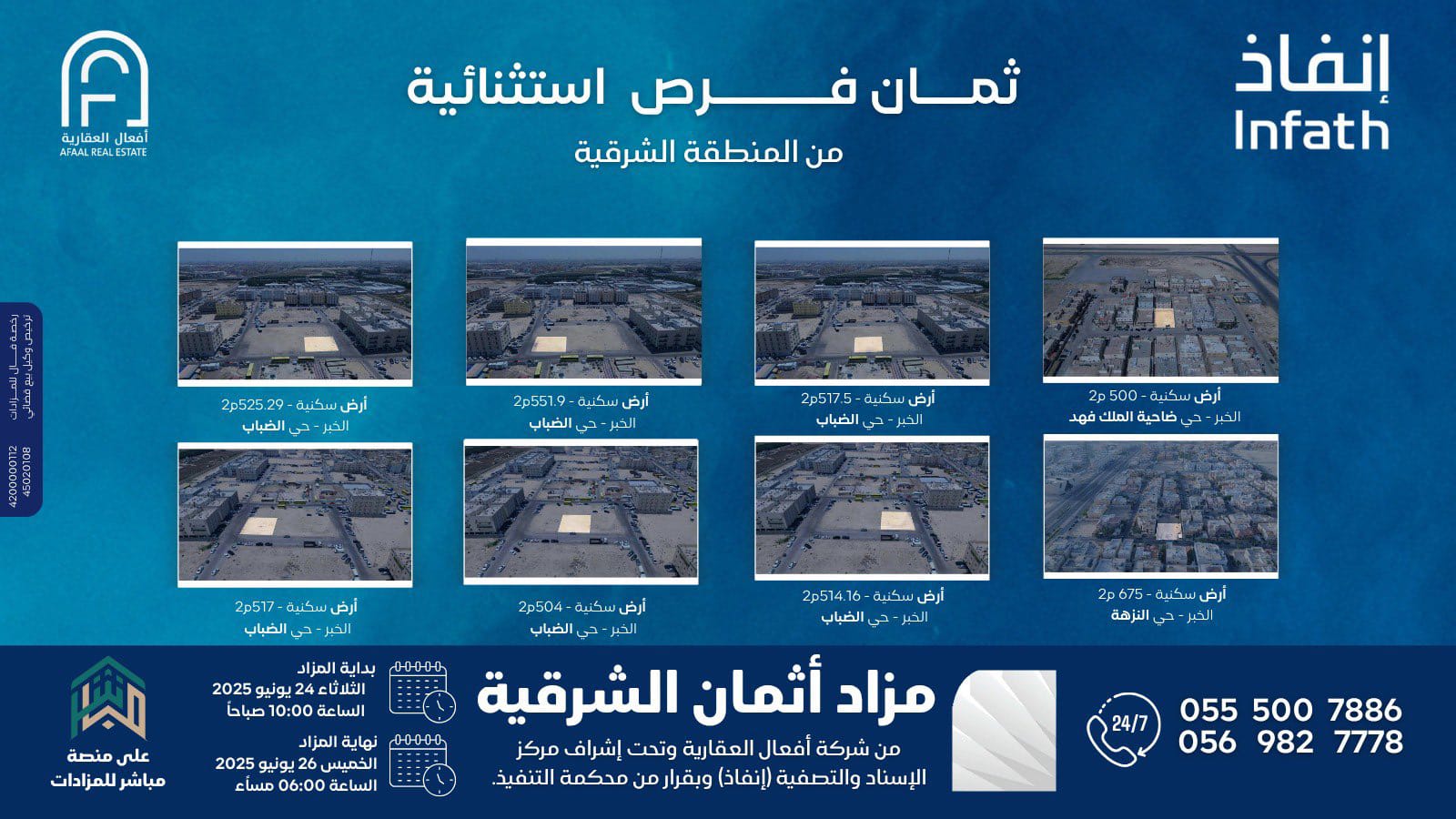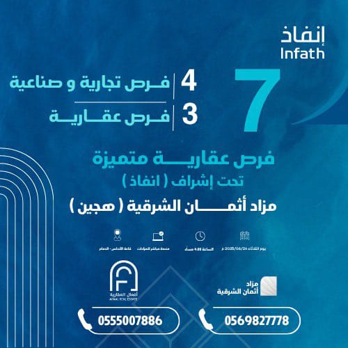تعلن شركة أفعال العقارية وتحت إشراف مركز الإسناد والتصفية «إنفاذ» وبموجب قرار محكمة التنفيذ، عن إقامة مزاد «أثمان الشرقية»، وذلك يوم الثلاثاء 24 يونيو 2025 حضورياً عند الساعة الرابعة مساءً في قاعة الأندلس للاحتفالات بالدمام، وإلكترونياً عبر منصة «مباشر للمزادات».