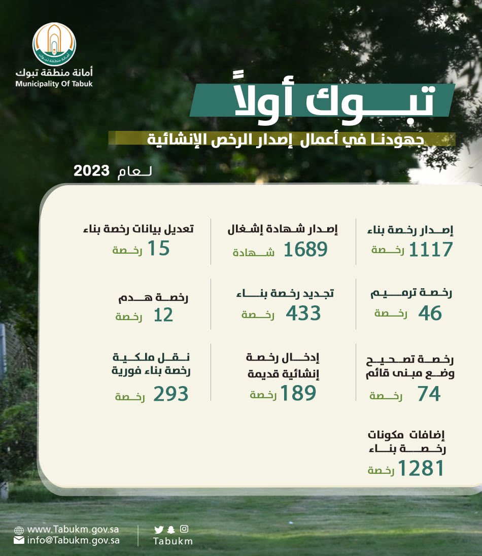 أصدرت أمانة منطقة تبوك خلال العام الماضي 2023, أكثر من 5000 رخصة إنشائية، شملت 10 أنواع مختلفة كرخص البناء والترميم والتسوير والهدم وغيرها.