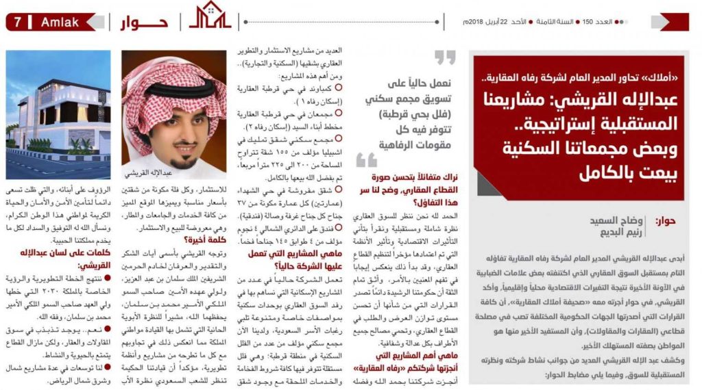 «أملاك» تحاور المدير العام لشركة رفاه العقارية.. عبدالإله القريشي: مشاريعنا المستقبلية إستراتيجية.. وبعض مجمعاتنا السكنية بيعت بالكامل