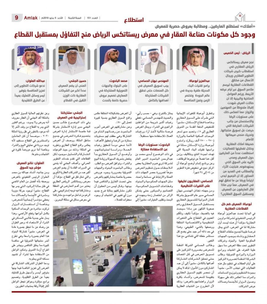 نجح معرض ريستاتكس الرياض العقاري في استقطاب كبرى شركات التطوير العقاري ورجال الأعمال من مختلق القطاعات العقارية ليرسم ملامح السوق عبر أيام عرضه الأربعة, ورغم العوامل المناخية والبيئية إلا أن صالات العرض شهدت إقبالاً ملحوظاً من المهتمين والزوار؛ مما انعكس ذلك على مستويات الرضا والاستحسان من جانب الشركات العارضة التي حرصت عل تسويق منتجاتها, وتحريك منحى مبيعاتها للأمام.