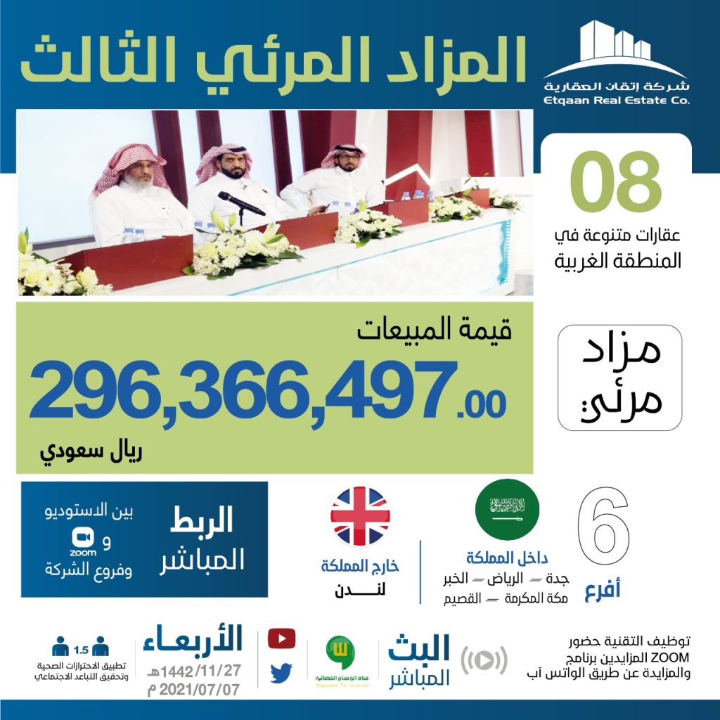أعلنت شركة إتقان العقارية عن نجاح تنفيذ وإدارة المزاد المرئي الثالث الذي بث عبر القنوات الفضائية والمنصات الرقمية لبيع 8 عقارات استثمارية في المنطقة الغربية، حيث وصلت المبيعات إلى 296,366,497 ريال شاملة لضريبة القيمة المضافة والسعي.
