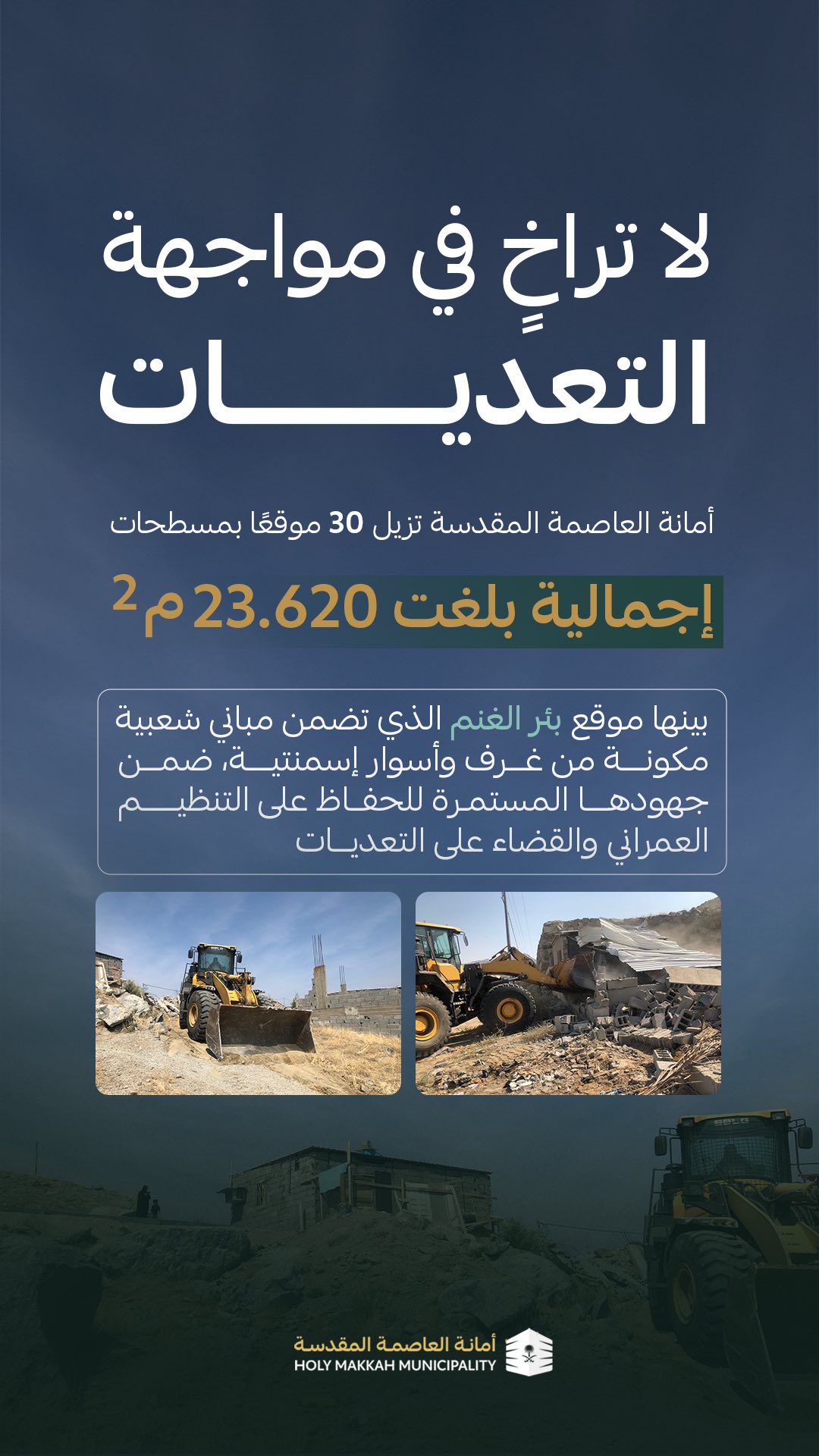 أزالت أمانة العاصمة المقدّسة عددًا من المسطحات والإحداثات غير النظامية والمقامة على أراضٍ حكومية من قِبل بعض المخالفين الذين لا يحملون صكوكًا شرعية وبطرقٍ عشوائية في بعض المواقع بمكة المكرّمة، وذلك بمشاركة عددٍ من الجهات الحكومية بالعاصمة المقدّسة.