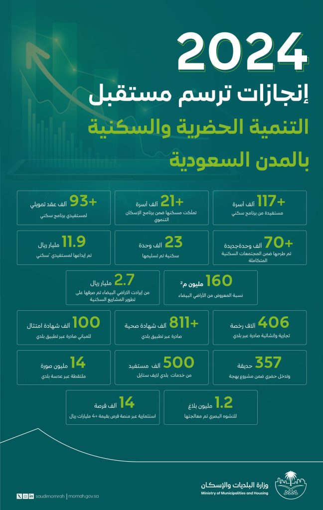 كشفت وزارة البلديات والإسكان عن أبرز المنجزات والأرقام التي تحققت في القطاعين البلدي والسكني خلال العام 2024، وذلك في إطار جهودها المستمرة للارتقاء بجودة الخدمات البلدية والسكنية وتحسين جودة الحياة في المدن السعودية وتوفير بيئة حضرية متكاملة تلبي تطلعات المجتمع السعودي بما يتماشى مع مستهدفات رؤية السعودية 2030.
