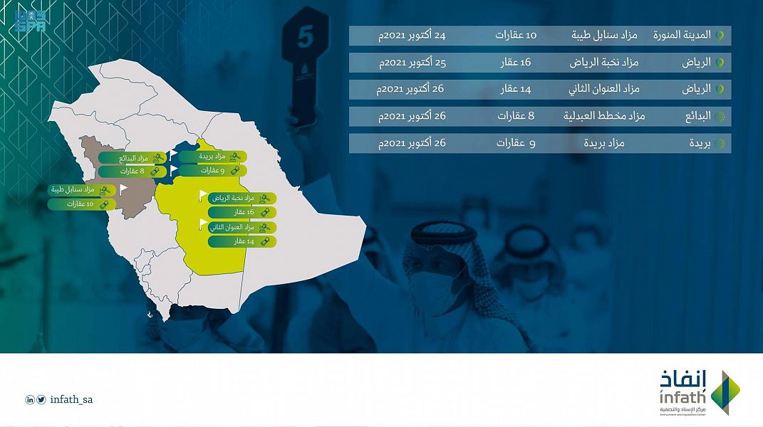 وتستعرض المزادات 57 فرصة استثمارية عقارية وبمساحات إجمالية تتجاوز 190 ألف متر مربع، حيث تبدأ بـ”مزاد سنابل طيبة” الإلكتروني المقام على 10 فرصٍ عقارية تتمثل في أراضٍ زراعية وسكنية وعمائر وبيوت سكنية بمنطقة المدينة المنورة، و”مزاد نخبة الرياض” المقام على 16 فرصة عقارية، تتمثل في عِدة أراضٍ سكنية وتجارية و7 فلل وعمارة وشقة سكنية بمدينة الرياض، ومزاد “العنوان الثاني” المقام على 14 فرصة عقارية تتمثل في عدة أراضٍ وعمائر تجارية وسكنية وورش صناعية بمدينة الرياض، ومزاد “بريدة” المقام على 9 فرص استثمارية تتمثل في عِدة أراضٍ سكنية وعمارة واستراحة بمدينة بريدة، ومزاد “مخطط العبدلية” الإلكتروني المقام على 8 فرصٍ استثمارية تتمثل في أراضٍ سكنية بمخطط العبدلية بمحافظة البدائع.