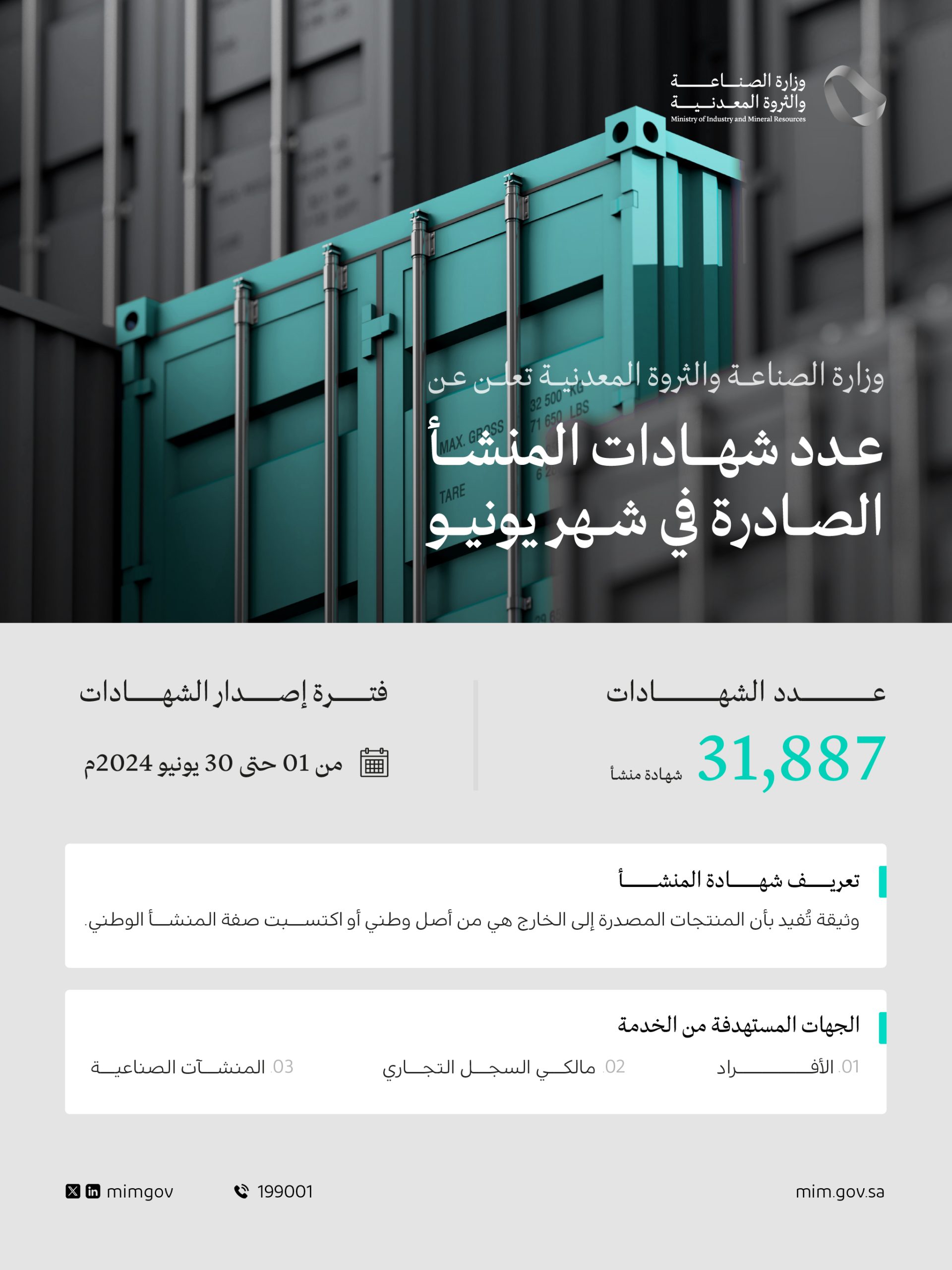 أصدرت وزارة الصناعة والثروة المعدنية 31,887 “شهادة منشأ” خلال شهر يونيو 2024، وذلك في إطار سعيها لدعم الخدمة وتسهيلها على المصدرين في مختلف القطاعات، سواء الصناعي، أو التجاري، أو قطاع الأفراد.