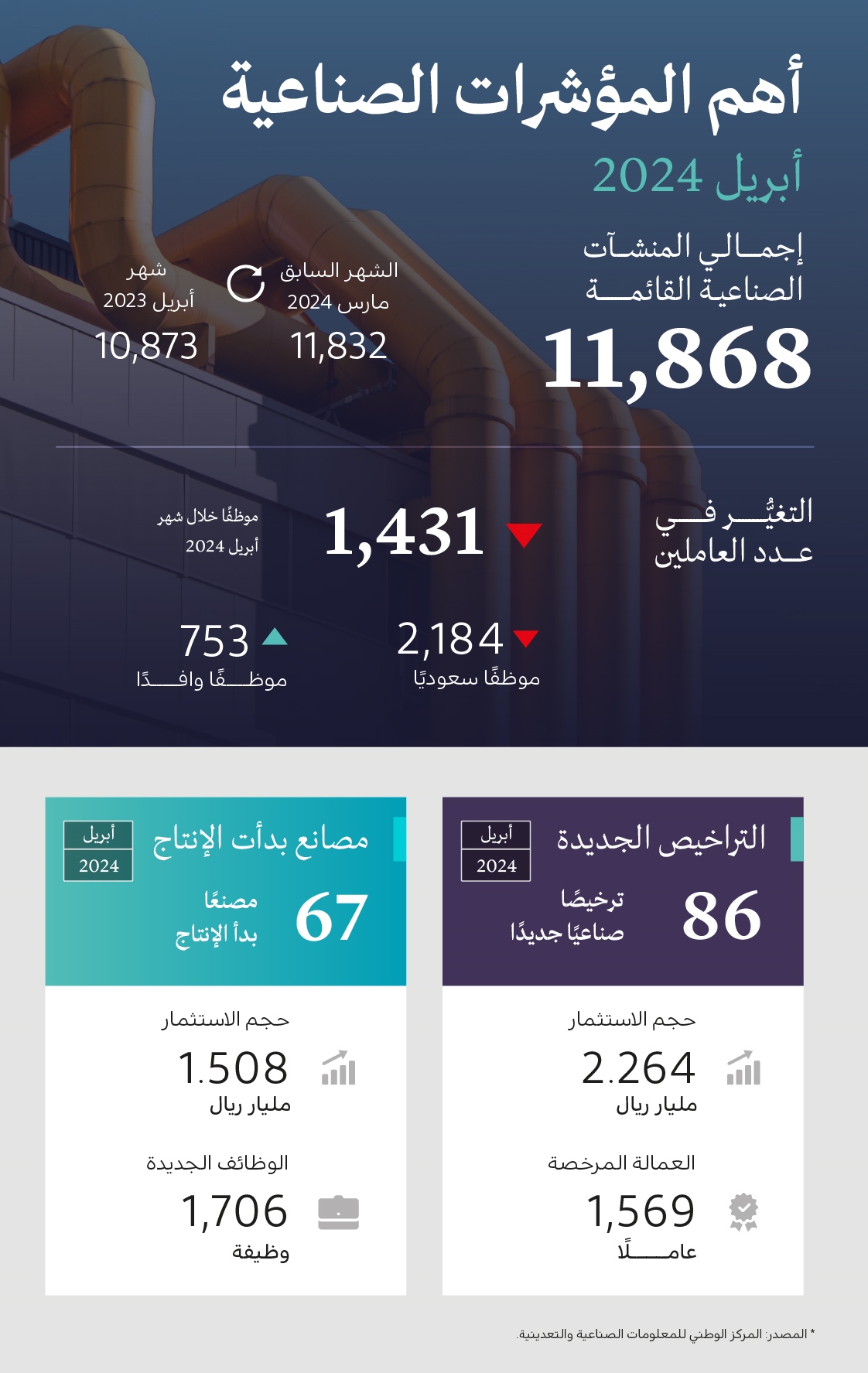 وأفاد التقرير الصادر عن المركز الوطني للمعلومات الصناعية والتعدينية التابع للوزارة، بأن إجمالي عدد التراخيص الصناعية التي أصدرتها الوزارة منذ مطلع العام الجاري حتى نهاية شهر أبريل بلغ 410 تراخيص، فيما وصل عدد المصانع القائمة وتحت الإنشاء في المملكة حتى نهاية الشهر نفسه إلى 11,868 مصنعاً، بحجم استثمارات بلغ 1,375 تريليون ريال.