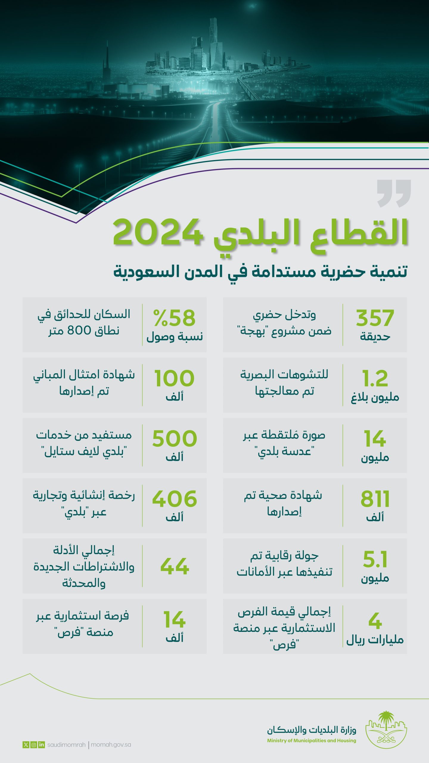 وأشارت الوزارة إلى استمرار جهود أنسنة المدن وتحسين المشهد الحضري لتعزيز رفاهية العيش في المملكة، إذ تم إطلاق المرحلة الثانية من مشروع بهجة الذي تضمن إنشاء وتنفيذ 357 حديقة وتدخلًا حضريًا في الأحياء والمجتمعات السكنية في مختلف المناطق، بهدف توفير مساحات خضراء واسعة لممارسة الأنشطة الترفيهية ورفع نصيب الفرد من المسطحات الخضراء، مما أسهم في زيادة وصول السكان إلى الحدائق ضمن نطاق 800 متر ليصل إلى 58%.