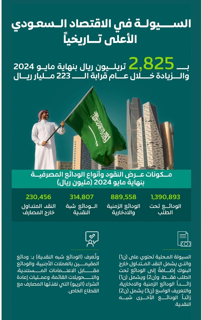 سجلت مستويات السيولة (النقود المتاحة) في منظومة الاقتصاد السعودي , نموها القوي لتبلغ قمتها بنهاية شهر مايو 2024، عند مستوى 2,825,715 مليون ريال، محققة نمواً سنوياً بنسبة تُقدر بـ 8.6% وبزيادة تجاوزت الـ 222,928 مليار ريال، مقارنة بنهاية الفترة المماثلة من العام 2023، التي كانت عند 2,602,786 مليون ريال، حيث يعكس مستوياتها عرض النقود بمفهومه الواسع والشامل (ن3)، وذلك وفق ما أظهرته بيانات النشرة الإحصائية الشهرية للبنك المركزي السعودي لشهر مايو 2024.