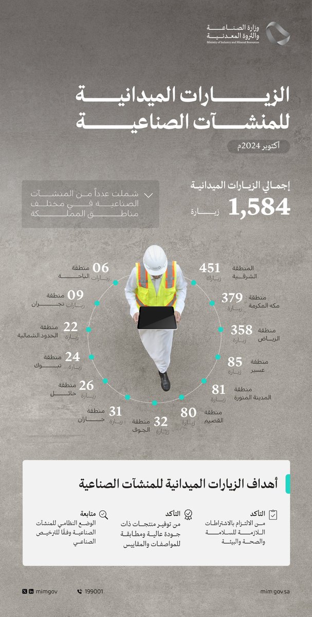 نفذت وزارة الصناعة والثروة المعدنية ممثلة في الإدارة العامة للفروع؛ “1,584” زيارة ميدانية على المنشآت الصناعية في جميع مناطق المملكة خلال شهر أكتوبر الماضي، وذلك في إطار جولات الوزارة الدورية لمتابعة المصانع، والوقوف على مدى جاهزيتها، والتأكد من التزامها بتطبيق معايير الجودة والاشتراطات اللازمة.
