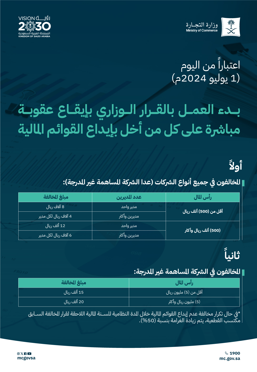 ووفقاً للقرار الوزاري، توقع عقوبة مباشرة على كل من أخلّ بإيداع القوائم المالية وفقاً لأحكام نظام الشركات ولائحته التنفيذية، وتكون الغرامة وفقًا للآتي: