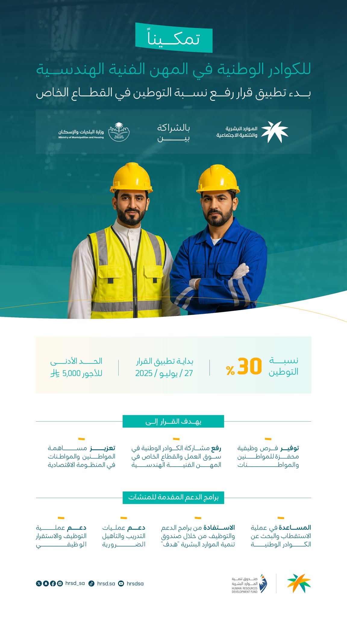 ويُنفذ قرار رفع نسب التوطين للمهن الفنية الهندسية بالشراكة مع وزارة البلديات والإسكان إلى نسبة 30% من إجمالي عدد العاملين في المهن المستهدفة اعتبارًا من اليوم، ويسري هذا القرار على جميع منشآت القطاع الخاص التي يعمل بها 5 عاملين فأكثر في المهن الفنية الهندسية، مع تحديد الحد الأدنى للأجور للاحتساب في نسب التوطين بـ5,000 ريال.
