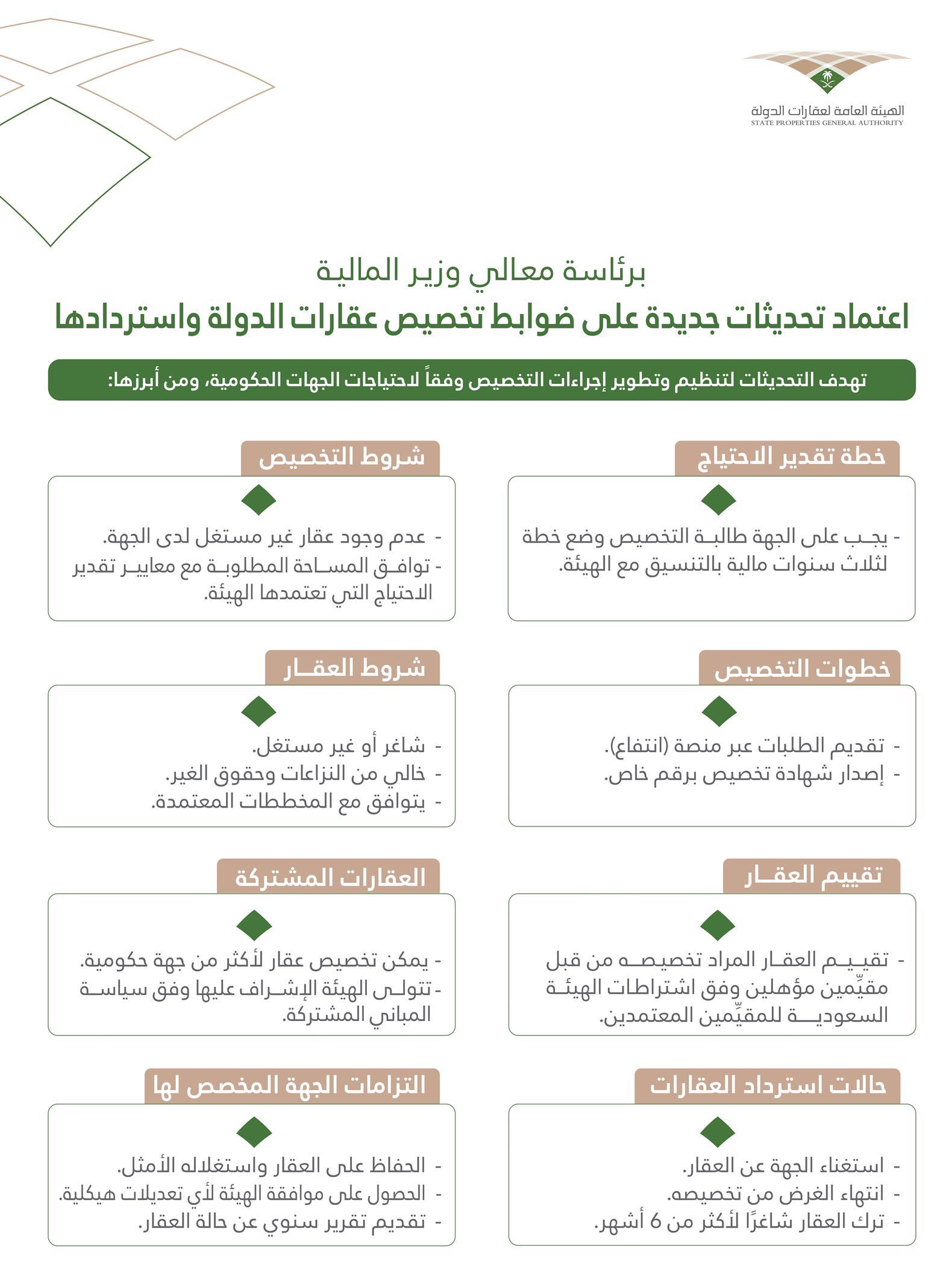 وبينت الهيئة أن الضوابط الجديدة تشترط أن يكون العقار مُقيَّمًا عند تخصيصه من قبل مقيمين مؤهلين وفق اشتراطات الهيئة السعودية للمقيمين المعتمدين، كما يسمح بتخصيص عقارات الدولة لأكثر من جهة حكومية، وستتولّى الهيئة الإشراف عليها وفق سياسة المباني المشتركة التي تعتمدها.
