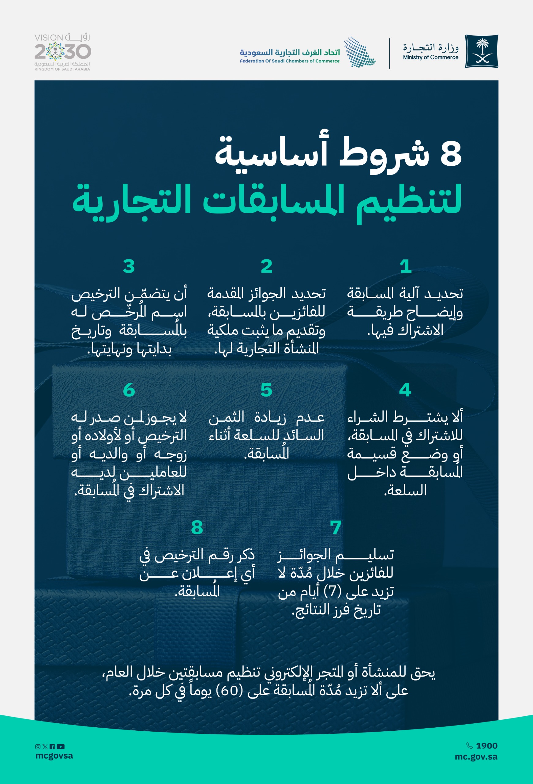 وتتمثل تلك الشروط في إصدار ترخيص إلكتروني من الغرفة التجارية قبل إجراء المسابقة، وإيضاح طريقة الاشتراك ونوعية الجوائز المقدمة للمتسابقين، وتواريخ بدء وانتهاء المسابقة على أن تتم عملية سحب الجوائز تحت إشراف وزارة التجارة.