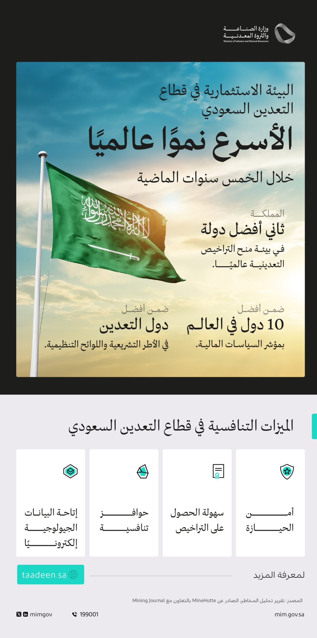 وسلّط التقييم العالمي لمخاطر الاستثمار في قطاع التعدين الضوء على جهود المملكة في تطوير قطاع التعدين، بدايةً من إطلاق الإﺳﺘﺮاﺗﻴﺠﻴﺔ اﻟﺸﺎﻣﻠﺔ ﻟﻠﺘﻌﺪﻳﻦ واﻟﺼﻨﺎﻋﺎت اﻟﻤﻌﺪنية في عام 2018م؛ لتعظيم القيمة المحققة من الموارد الطبيعية، مدعومة بتطوير نظام الاستثمار التعديني، الذي يشكل البنية التشريعية والنظامية للقطاع، ويوفر بيئة واضحة وشفافة وميسرة للمستثمرين في قطاع التعدين، إضافة إلى الإصلاحات الشاملة والمحفزات للمستثمرين في القطاع.