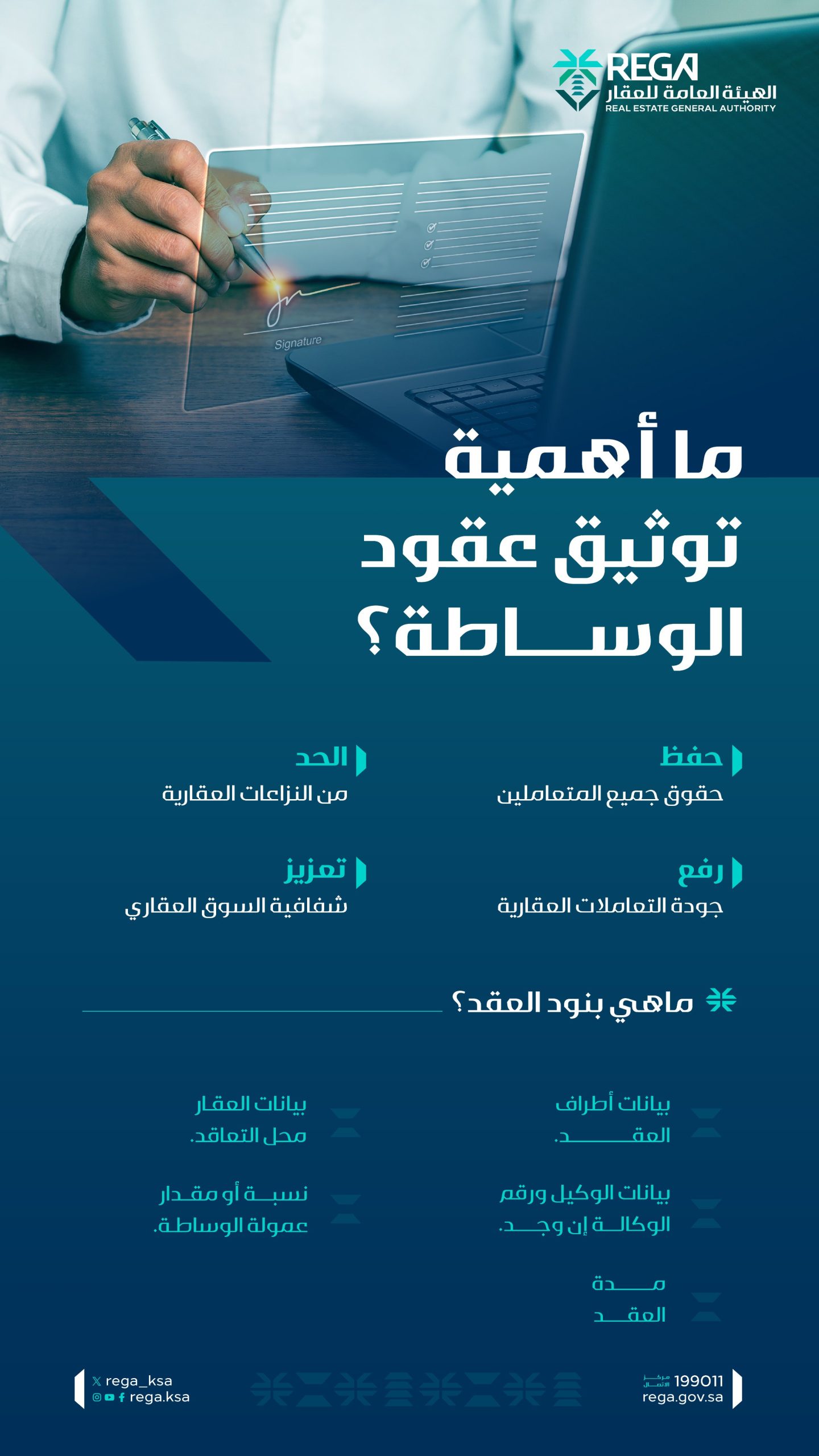 كذلك أوضحت الهيئة في إنفوجراف نشرته على حسابها بموقع التواصل الاجتماعي “إكس”، بنود عقود الوساطة العقارية، وهي كالآتي: