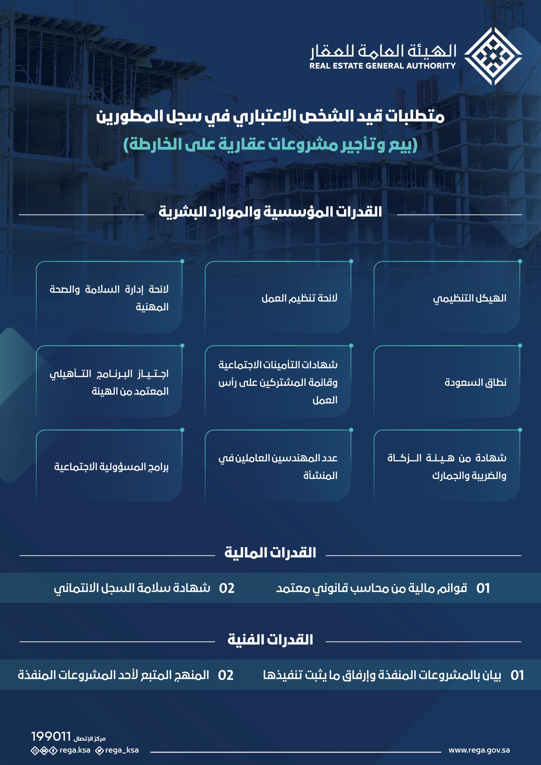 كشفت الهيئة العامة للعقار عن متطلبات، قيد الشخص الاعتباري في سجل المطورين العقاريين في نظام بيع وتأجير مشروعات عقارية على الخارطة.