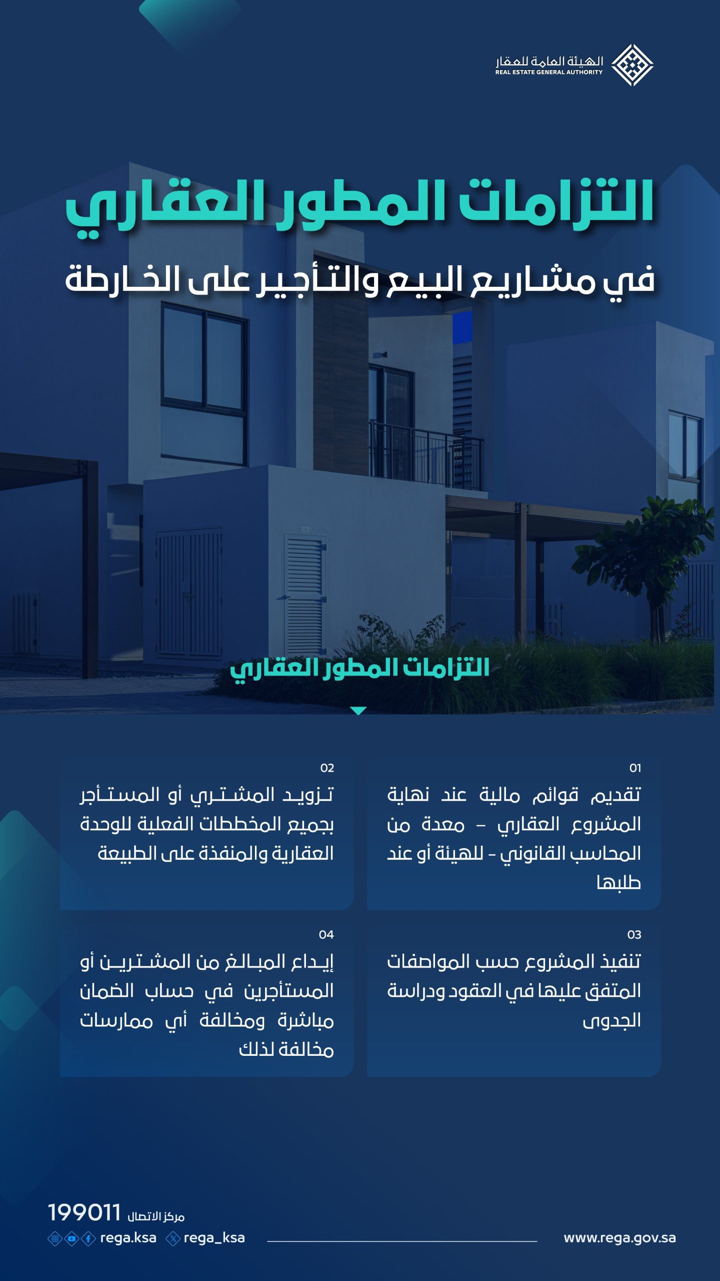 كشفت الهيئة العامة للعقار، عن 4 التزامات للمطور العقاري حددتها اللائحة التنفيذية لنظام بيع وتأجير مشروعات عقارية على الخارطة.