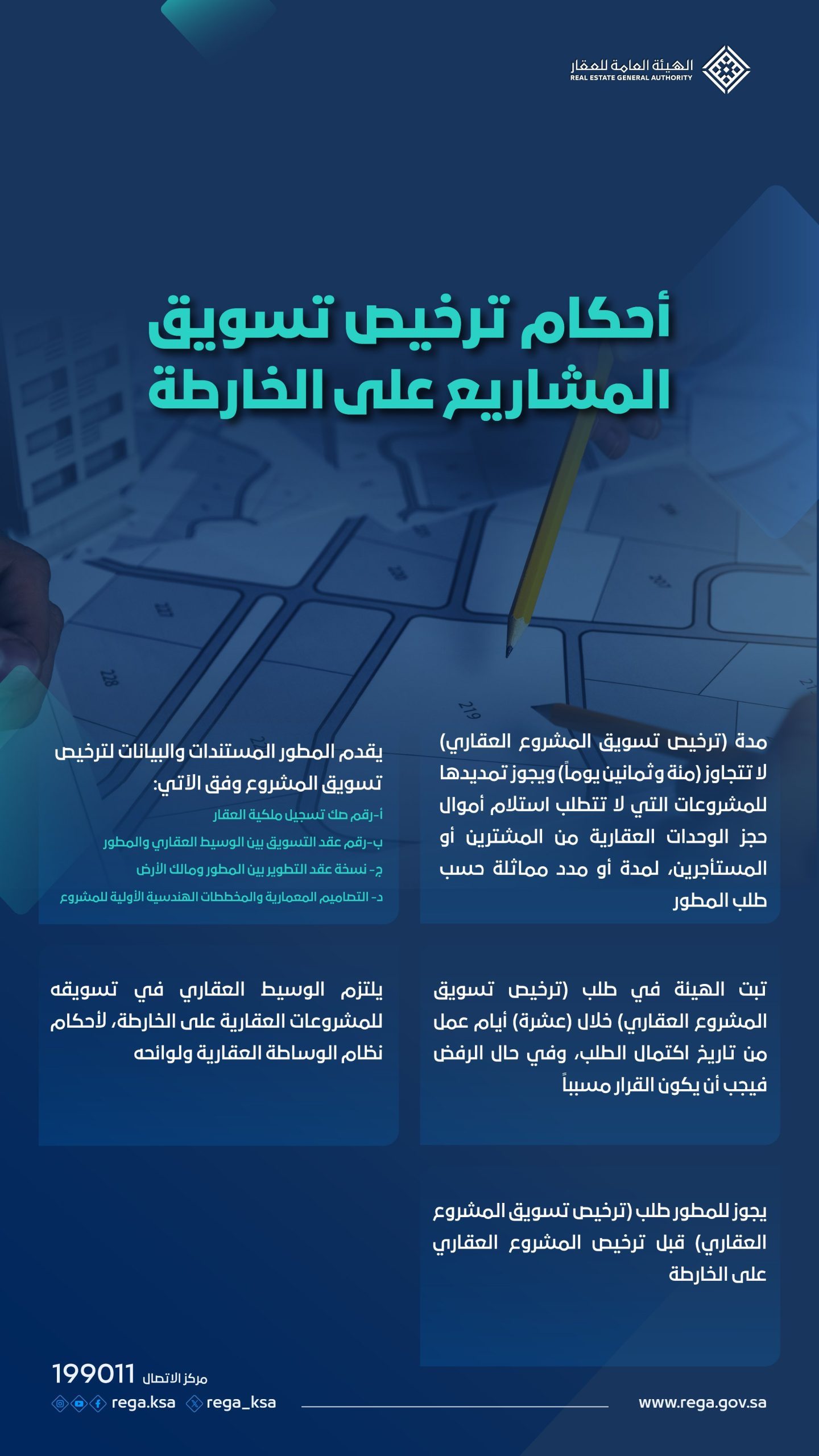 5- يجوز للمطور طلب (ترخيص تسويق المشروع العقاري) قبل ترخيص المشروع العقاري على الخارطة.