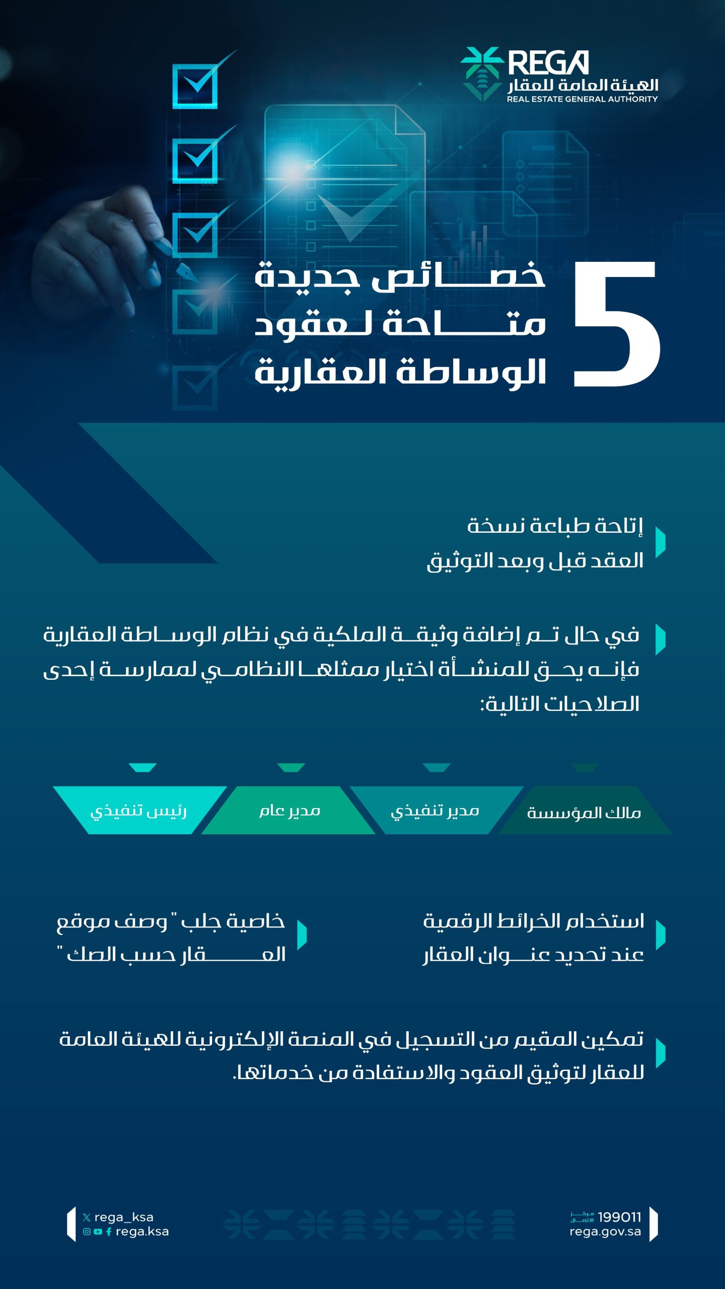 أعلنت الهيئة العامة للعقار، عن 5 خصائص جديدة متاحة لعقود الوساطة العقارية التى تهدف إلى تسهيل عملية توثيقها.