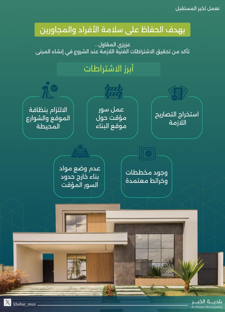 أكدت بلدية محافظة الخبر على ضرورة الالتزام بالاشتراطات الفنية المنظمة لأعمال البناء، في إطار جهودها الرامية إلى تعزيز السلامة العامة للمواطنين والمقيمين، وتنظيم أعمال التشييد بما يتوافق مع المعايير المعتمدة والضوابط النظامية.