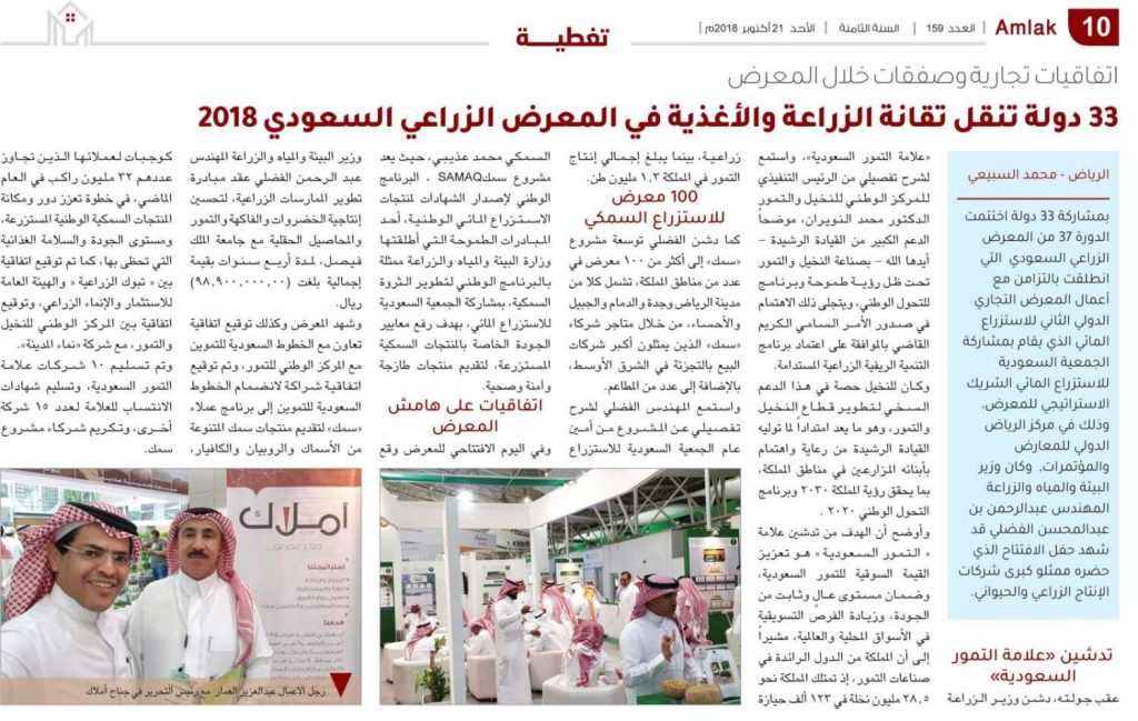 وشهد المعرض وكذلك توقيع اتفاقية تعاون مع الخطوط السعودية للتموين مع المركز الوطني للتمور، وتم توقيع اتفاقية شراكة لانضمام الخطوط السعودية للتموين إلى برنامج عملاء «سمك» لتقديم منتجات سمك المتنوعة من الأسماك والروبيان والكافيار، كوجبات لعملائها الذين تجاوز عددهم 32 مليون راكب في العام الماضي, في خطوة تعزز دور ومكانة المنتجات السمكية الوطنية المستزرعة، ومستوى الجودة والسلامة الغذائية التي تحظى بها، كما تم توقيع اتفاقية بين « تبوك الزراعية « والهيئة العامة للاستثمار والإنماء الزراعي، وتوقيع اتفاقية بين المركز الوطني للنخيل والتمور، مع شركة «نماء المدينة».