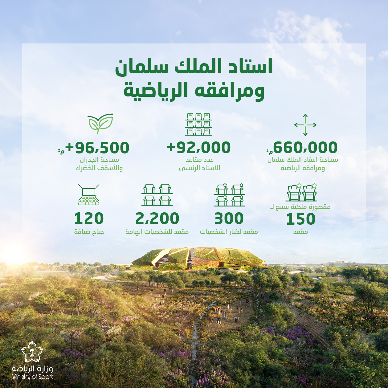 أعلنت الهيئة الملكية لمدينة الرياض ووزارة الرياضة عن التصاميم والتصورات المستقبلية لاستاد الملك سلمان ومرافقه الرياضية أحد أكبر الملاعب الرياضية عالمياً، الذي سيكون المقر الرئيسي للمنتخب السعودي وسيستضيف كبرى الفعاليات والأنشطة الرياضية.
