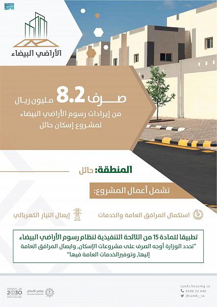 أعلن برنامج “الأراضي البيضاء” عن صرف 8.2 مليون ريال لاستكمال تنفيذ وإيصال خدمات البنية التحتية في مشروع إسكان حائل، مبينًا أن هذا المبلغ يمثل جزءًا من إيرادات البرنامج التي جرى تحصيلها من الرسوم المفروضة على الأراضي البيضاء الواقعة داخل النطاق العمراني في المدن الخاضعة للنظام ضمن مرحلته الأولى.