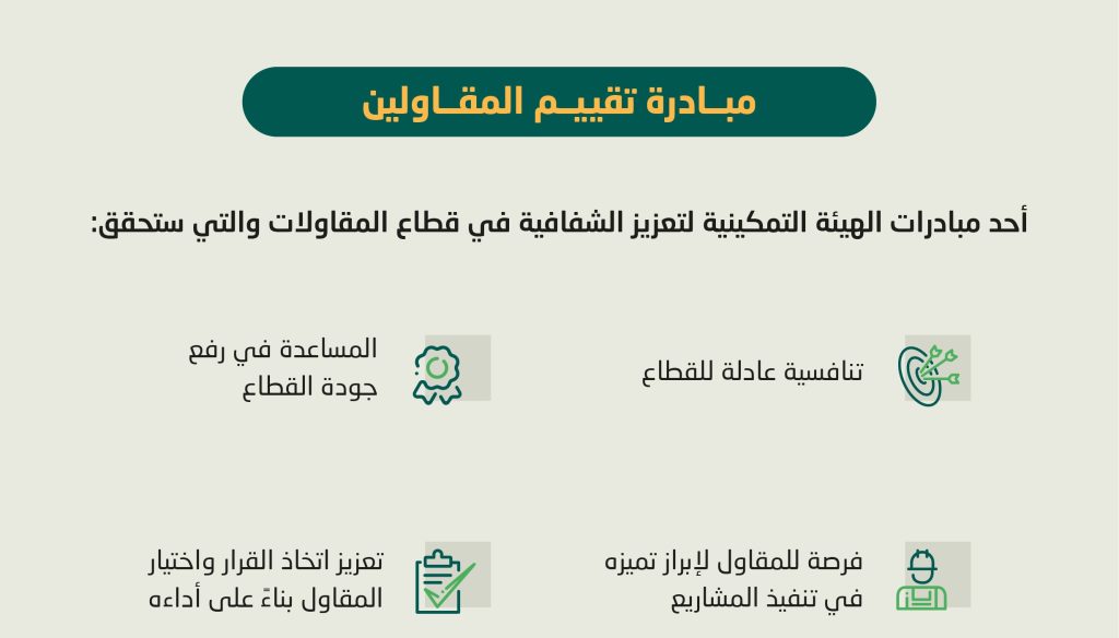 وبحسب بيان للهيئة حصلت “أملاك” على نسخة منه، فتعد المبادرة أحد مبادرات الهيئة التمكينية والمرتبطة بهدف الهيئة الاستراتيجي وهو تعزيز الشفافية في قطاع المقاولات؛ حيث تمكن المبادرة من بناء قاعدة بيانات تحتوي على تقييم المقاول بمعايير دقيقة وذات موثوقية عالية بالتعاون مع الجهات المعنية وستخلق المبادرة فرصاً للمقاولين لإبراز تميزهم في تنفيذ المشاريع في تخصصاتهم مما سيتيح تنافسية عادلة للقطاع ومما سيساعد في رفع جودته.