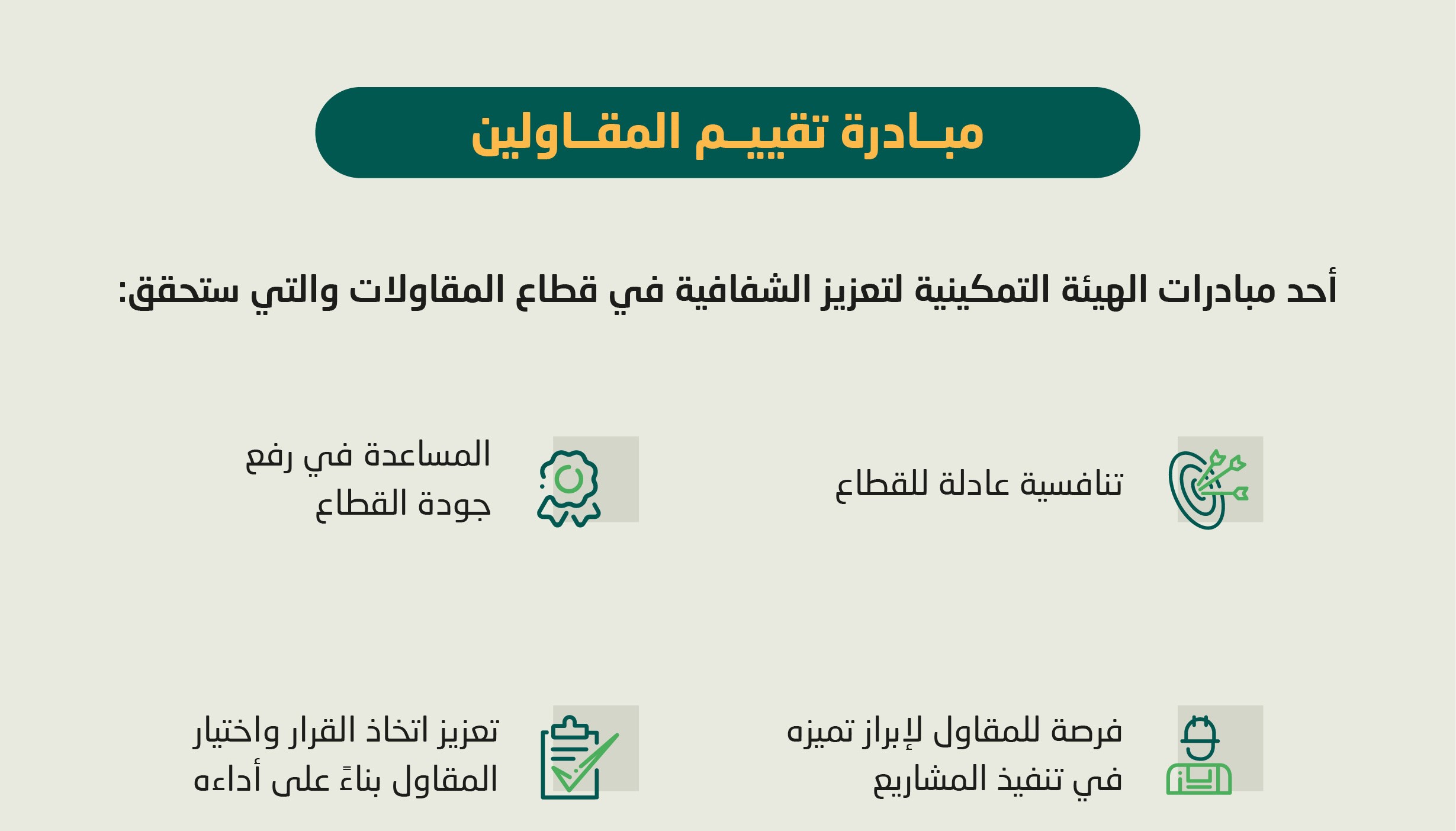 يعتبر قطاع المقاولات من القطاعات الأضخم اقتصاديًا بعد القطاع النفطي في المملكة العربية السعودية، مما يجعل شفافيته مرتبطة بازدهاره؛ وانطلاقًا من دورها في تنظيم القطاع، أطلقت الهيئة السعودية للمقاولين مبادرة تقييم المقاولين.