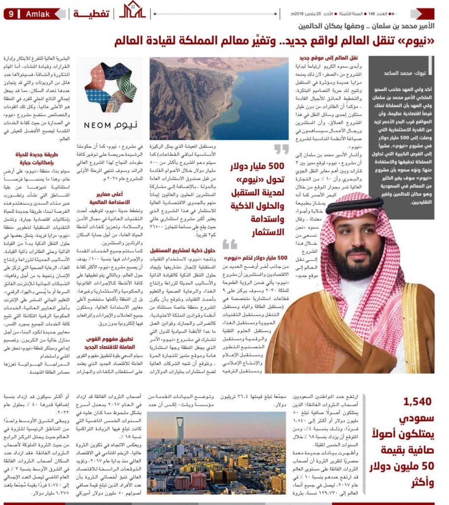 أكد ولي العهد صاحب السمو الملكي الأمير محمد بن سلمان ولي العهد بأن المملكة تملك فرصاً اقتصادية عظيمة، وأن المواقع قرب البحر الأحمر تزيد من القدرة الاستثمارية التي وصلت إلى 500 مليار دولار في مشروع «نيوم», مشيراً إلى الفرص الكبيرة التي تحاول المملكة تحقيقها والاستفادة منها؛ ونوّه سموه بأن مشروع «نيوم» سوف يغير الكثير من المعالم في السعودية وهو مكان للحالمين ولغير التقليديين.