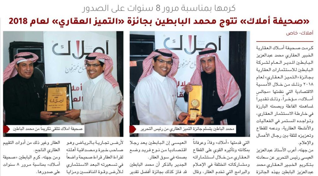 كرمت صحيفة أملاك العقارية الخبير العقاري محمد عبدالعزيز البابطين المدير العام لشركة البابطين للاستثمارات العقارية بجائزة «التميز العقاري» لعام 2018 وذلك من خلال الأمسية الاقتصادية التي نظمتها «مجالس أملاك», مؤخراً, وذلك تقديراً لمساهمته الفاعلة وبصمته البارزة في خارطة الاستثمار العقاري , وتواجده المستمر في الفعاليات والأنشطة العقارية, ودعمه للقطاع وتعزيزه للثقة بين رجال الأعمال والإعلام.