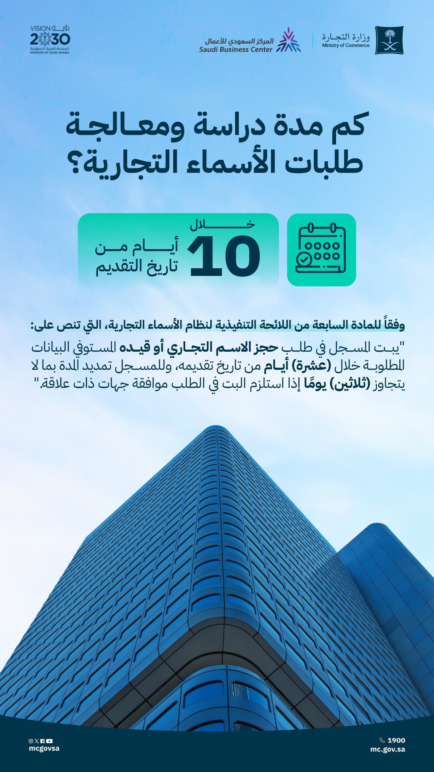 وأشارت الوزارة إلى أن مدة دراسة ومعالجة الاسم التجاري، تتم خلال عشرة أيام من تاريخ تقديم الطلب المستوفي البيانات، وذلك وفقًا للمادة السابعة من اللائحة التنفيذية لنظام الأسماء التجارية التي تنص على: يبت المسجل في طلب حجز الاسم التجاري أو قيده المستوفي البيانات المطلوبة خلال (عشرة) أيام من تاريخ تقديمه، وللمسجل تمديد المدة بما لا يتجاوز (ثلاثين) يومًا إذا استلزم البت في الطلب موافقة جهات ذات علاقة.
