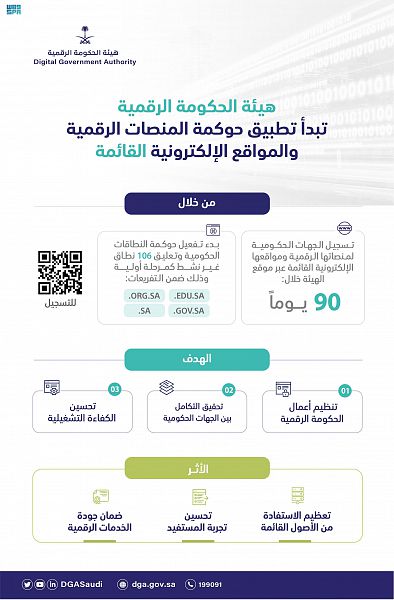ويهدف ذلك إلى تنظيم النطاقات الحكومية على شبكة الانترنت والتأكد من سلامة سجلات النطاقات وحفظ حقوق الجهات المسجلة وربطها بمنصات ومواقع الجهات الحكومية مما يسهل تنظيم أعمال الحكومة الرقمية ويساهم في تسهيل الاجراءات وسهولة الوصول.