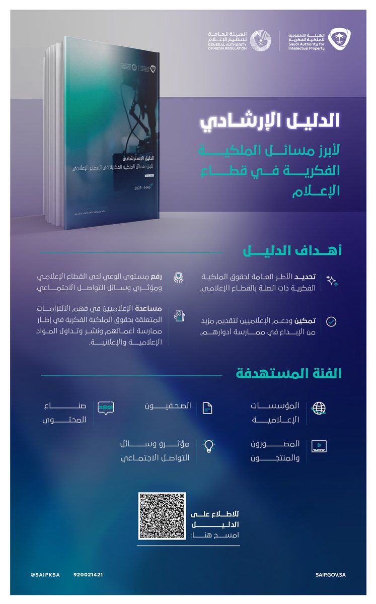 وأوضحت الملكية الفكرية أن الدليل يسلط الضوء على وجود قوانين وتشريعات تحمي حقوق الملكية الفكرية ضمن قطاع الإعلام، مشددة على ضرورة استفادة الممارسين الإعلاميين من الدليل الإرشادي كمرجع شامل فيما يتعلق بمخالفات الملكية الفكرية، وقد أتيح الدليل للاطلاع على موقع الملكية الفكرية www.saip.gov.sa.