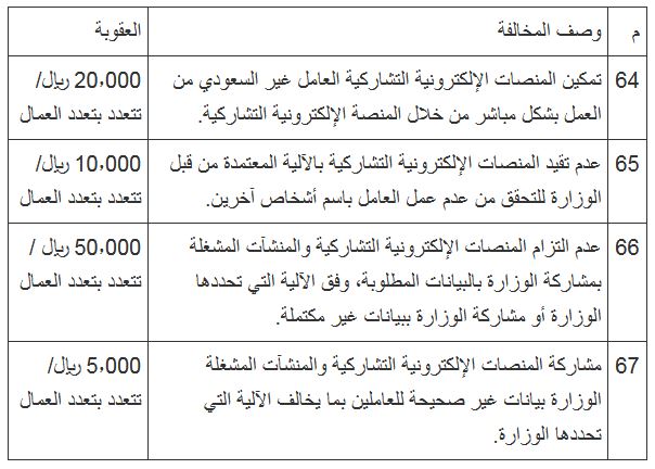 وافق وزير الموارد البشرية والتنمية الاجتماعية، وبناءً على الصلاحيات الممنوحة له نظاماً، على إضافة فقرات بالأرقام (64، 65، 66، 67) إلى جدول المخالفات والعقوبات المقابلة لها الواردة في الفقرة (1) من البند (أولاً) من القرار الوزاري رقم (178743).