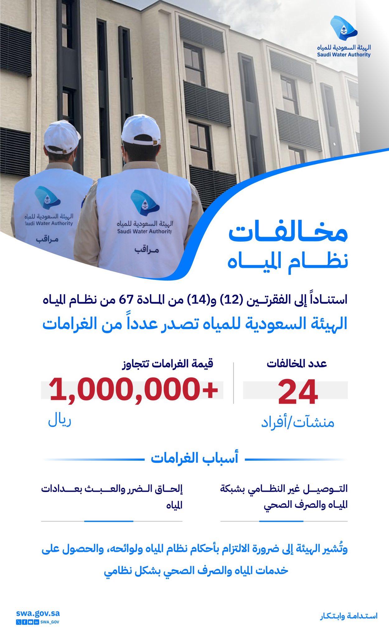 وشملت القرارات غرامات مالية إجمالية بما يتجاوز (مليون) ريال لعدد (٢٤) مخالفاً، وذلك وفقًا لأحكام الفقرتين (12) و(14) من المادة (67) من نظام المياه، والمتضمنة “التوصيل بشبكة المياه والصرف الصحي بطريقة غير نظامية”، و”إلحاق الضرر بمعدات وأجهزة المرخص له”.