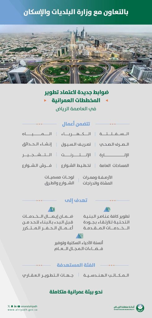 ومن شأن هذه الضوابط أن تسهم في رفع جودة المخططات الجديدة، وتأسيس أحياء متكاملة تلبّي احتياجات السكان، وتعزز كفاءة استخدام الأراضي، وتدعم زيادة المسطحات الخضراء، ومسارات المشاة والدراجات، مما يُواكب أهداف الأمانة في أنسنة المدينة وتحقيق مستهدفات رؤية المملكة 2030، ويدعم مكانة العاصمة مدينةً حديثة، مرنة، ومستدامة.