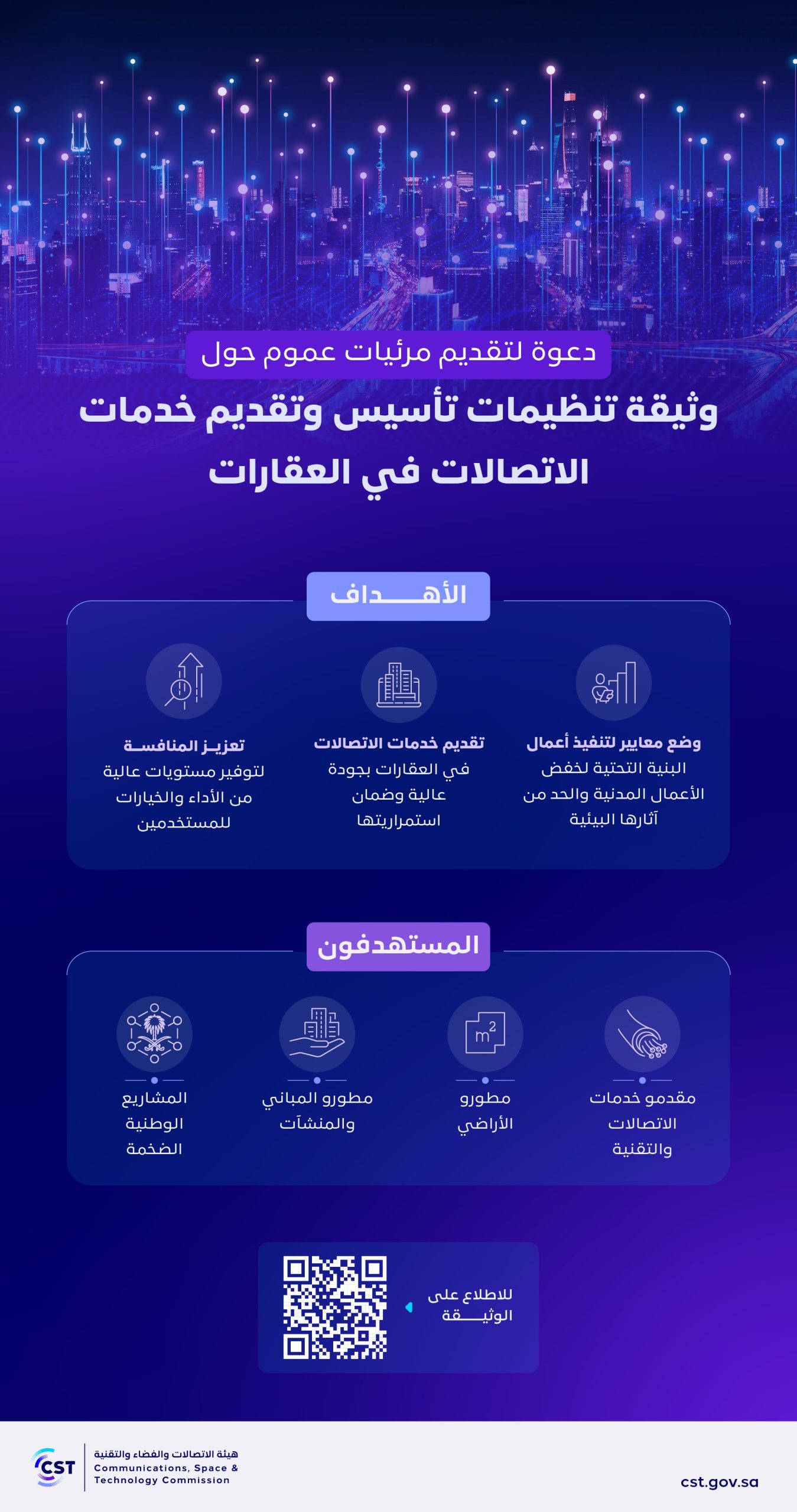 دعت هيئة الاتصالات والفضاء والتقنية قطاع المواصلات والاتصالات للمشاركة في تقديم المرئيات والملاحظات حول “تنظيمات تأسيس وتقديم خدمات الاتصالات في العقارات” خلال الفترة من 4 سبتمبر إلى 3 أكتوبر 2024. ويهدف هذا المشروع إلى تعزيز البنية التحتية الرقمية في الأراضي والمنشآت، وتقديم خدمات اتصالات بجودة عالية وكفاءة اقتصادية، مما يسهم في تعزيز المنافسة وتوفير خيارات متعددة للمستخدمين.