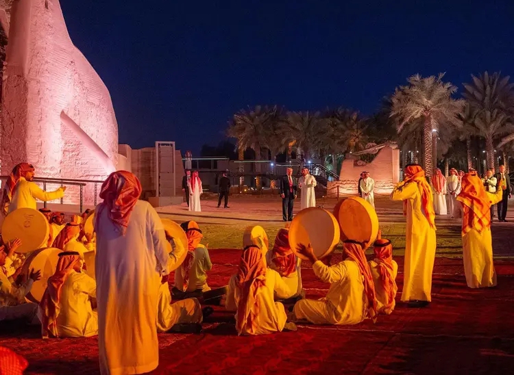 وشاهد سمو ولي العهد وفخامة الرئيس الأمريكي عرضًا تراثيًا من الفن الشعبي السعودي، كما تم التقاط صورة تذكارية من أمام قصر سلوى، أحد القصور التاريخية الذي كان مركزًا للحُكم في عهد الدولة السعودية الأولى.
