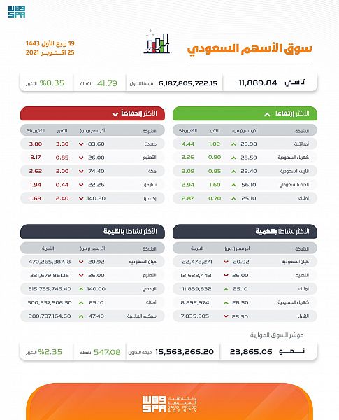 أغلق مؤشر الأسهم السعودية الرئيس اليوم، مرتفعاً 41.79 نقطة ليقفل عند مستوى 11889.84 نقطة, وبتداولات بلغت قيمتها 6.1 مليارات ريال.