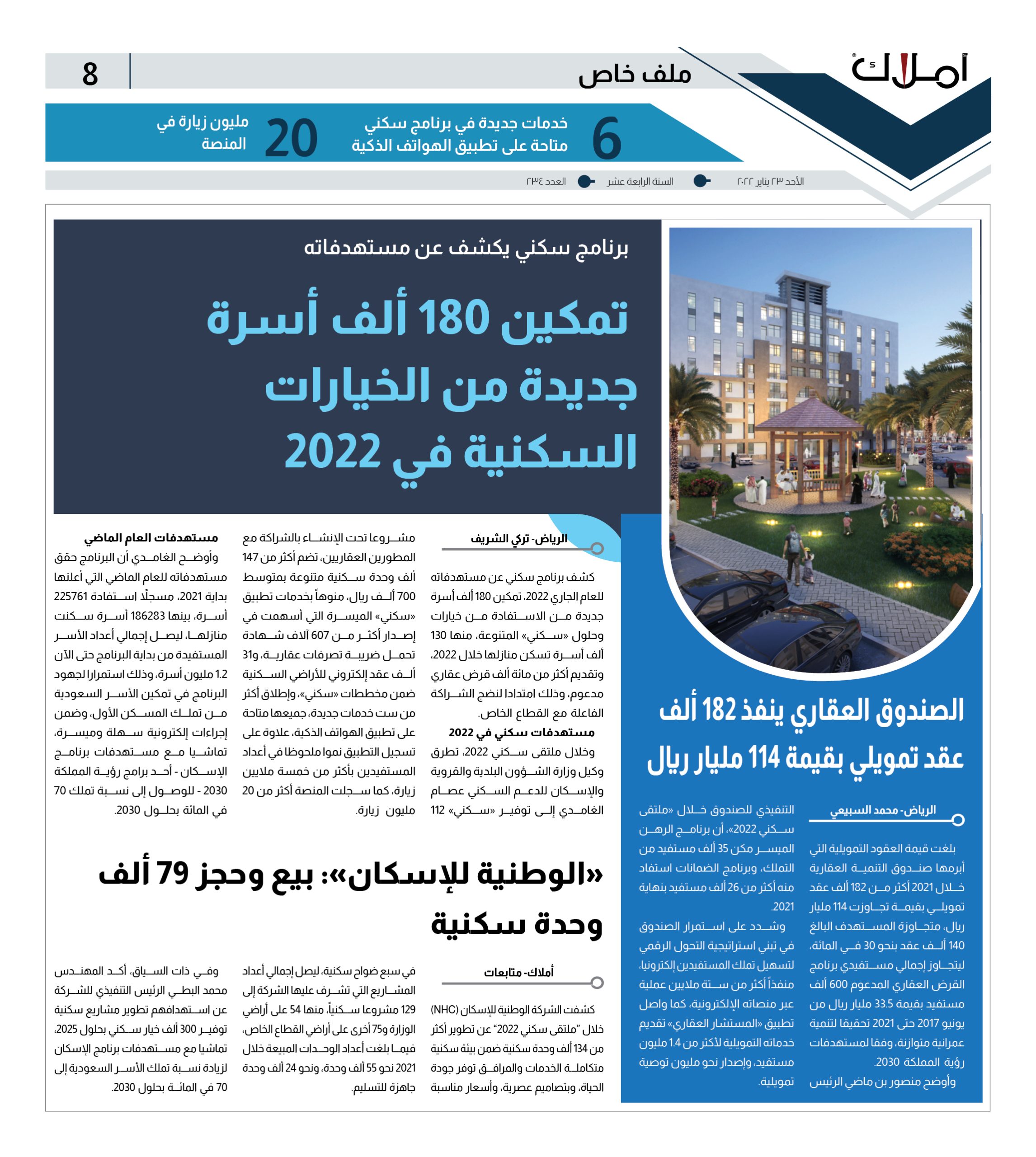 كشف برنامج سكني عن مستهدفاته للعام الجاري 2022، تمكين 180 ألف أسرة جديدة من الاستفادة من خيارات وحلول “سكني” المتنوعة، منها 130 ألف أسرة تسكن منازلها خلال 2022، وتقديم أكثر من مائة ألف قرض عقاري مدعوم، وذلك امتدادا لنضج الشراكة الفاعلة مع القطاع الخاص.