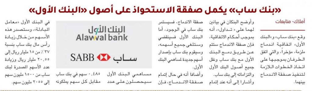 وأضافا أنه في حال إتمام صفقة الاندماج، فإن مساهمي البنك الأول سيحصلون على عدد 0.485 سهم في بنك ساب مقابل كل سهم يملكونه في البنك الأول «معامل المبادلة»، وستصدر هذه الأسهم من خلال زيادة رأس مال بنك ساب بنسبة 37 % من 15 مليار ريال إلى 20.55 مليار ريال وزيادة عدد الأسهم المصدرة لبنك ساب من 1500 مليون سهم إلى 2055 مليون سهم.