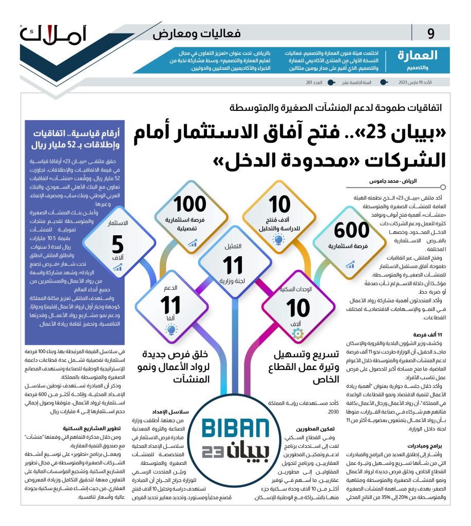 حقق ملتقى «بيبان 23» أرقامًا قياسية في قيمة الاتفاقيات والإطلاقات، تجاوزت 52 مليار ريال، ووقَّعت «منشآت» اتفاقيات تعاون مع البنك الأهلي السعودي، والبنك العربي الوطني، وبنك ساب، ومصرف الإنماء، وغيرها.