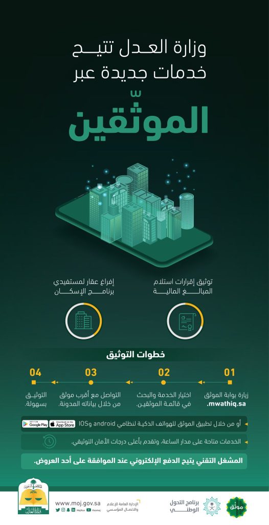 وبالعودة للوزارة فأكدت أن خدمة الموثّق تهدف إلى التسهيل على الأفراد والمنشآت للاستفادة من الخدمات ذاتها المقدمة عبر كتابات العدل، بإتاحتها في أي وقت ومن أي مكان بجودة عالية ووقت قصير، مبينة أن خدمة الموثق تقدم العديد من الخدمات التوثيقية تشمل إصدار الوكالات أو فسخها وتوثيق عقود الشركات، إضافة إلى تصحيح الصكوك، عبر الموثّقين المرخصين من وزارة العدل المتواجدين في جميع أنحاء المملكة، كما يستطيع المستفيد طلب خدمة التوثيق عن طريق الموقع الإلكتروني mwathiq.sa أو من خلال تطبيق الموثق للهواتف الذكية لنظامي Androidو IOS.