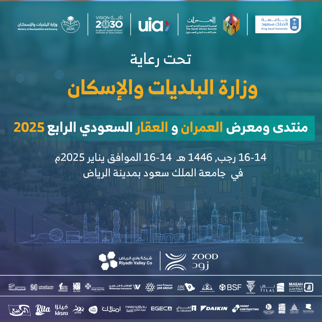 تحتضن جامعة الملك سعود منتدى العمران والعقار السعودي الرابع والمعرض المصاحب، وذلك خلال المدة 14 – 16 يناير الجاري برعاية وزارة البلديات والإسكان، وذلك بالبهو الرئيسي بجامعة الملك سعود بالرياض.
