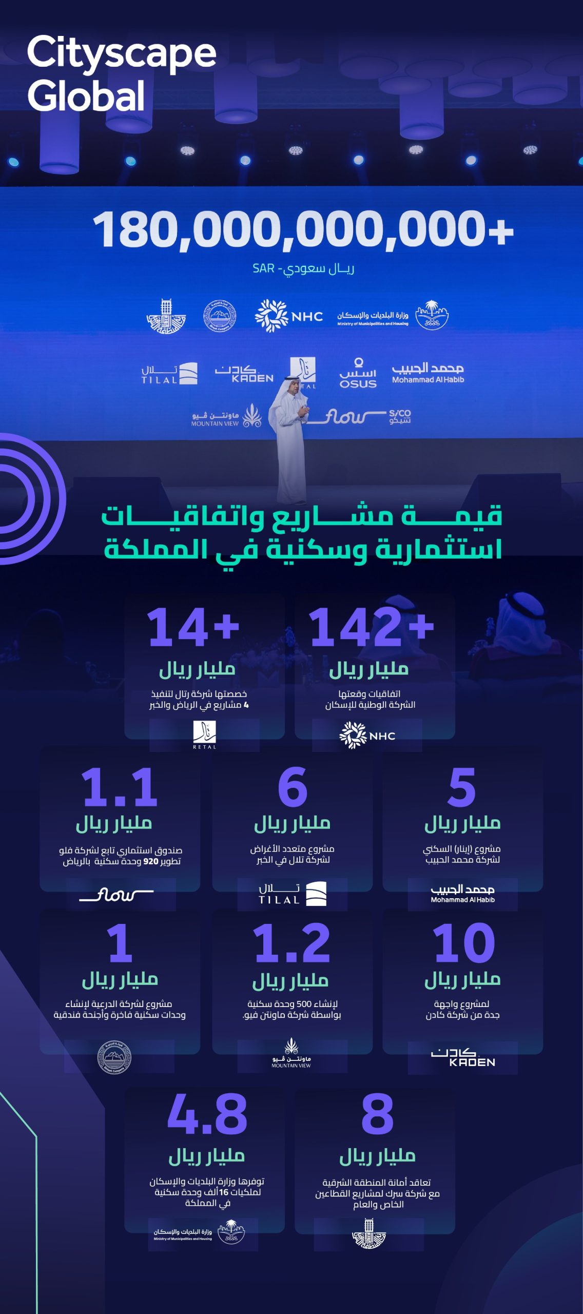 وامتدادًا للاتفاقيات الاستراتيجية والمشروعات الكبرى التي أطلقت في معرض سيتي سكيب أمس بقيمة تجاوزت 180 مليار ريال، أعلنت وزارة البلديات والإسكان اليوم عن مشاريع متعددة بقيمة تقترب من 4.8 مليارات ريال، لتوفير أكثر من 16 ألف وحدة سكنية في مختلف مناطق المملكة خلال عام, كما أعلنت أمانة المنطقة الشرقية عن تعاقدها مع شركة سرك وعدد من الشركات الوطنية لتنفيذ مشاريع بقيمة إجمالية تصل إلى 8 مليارات ريال.