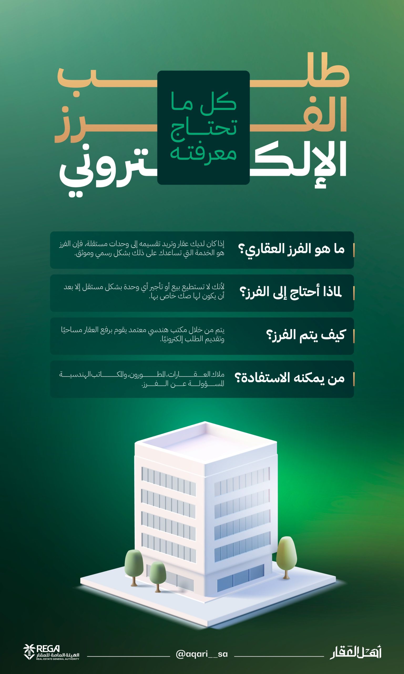 وتقدم الهيئة العامة للعقار خدمة الفرز العقاري الإلكتروني، وهي خدمة تهدف إلى تمكين مالكي العقارات من تقسيم عقاراتهم إلى وحدات مستقلة، ومنح كل وحدة رقمًا خاصًا بها يتيح التعامل معها قانونيًا ككيان مستقل سواء بالبيع أو التأجير أو التسجيل في الأنظمة العقارية المختلفة.