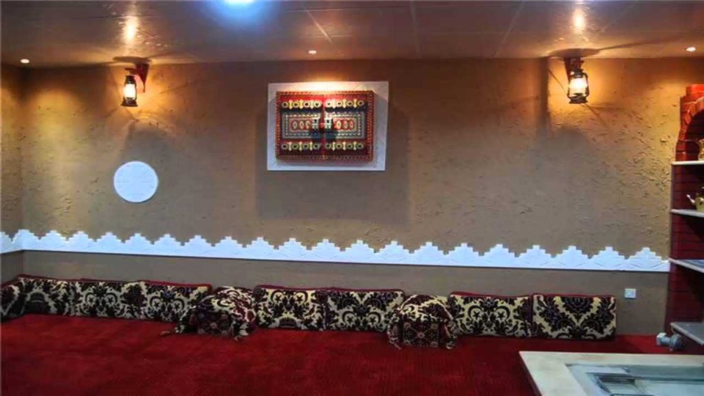 يعلق على الجدران بعض القطع التراثية كالسفرة و حاملة الحاجيات و بعض البنادق القديمة أو قطع السلاح اليدوي كالسيوف و الخناجر .